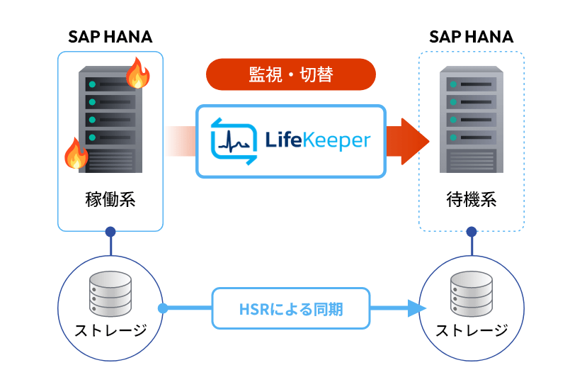 HAクラスター『LifeKeeper』と合わせて利用することで、HSRをLifeKeeperが制御し、SAP HANAの障害を自動検知、自動切替し、迅速に復旧することができます。