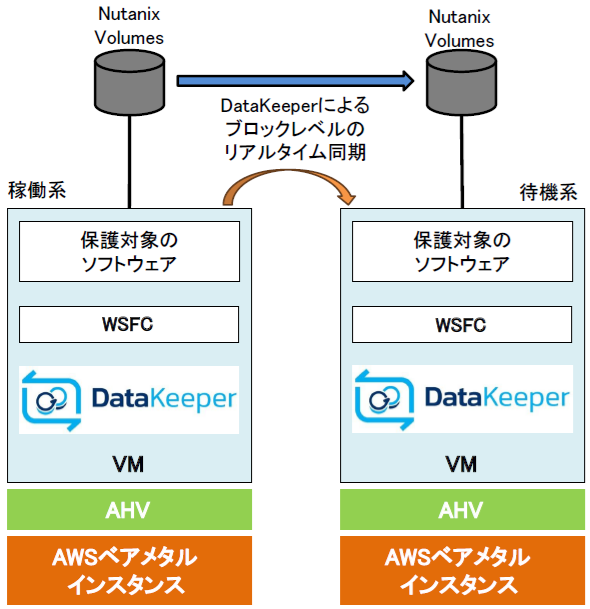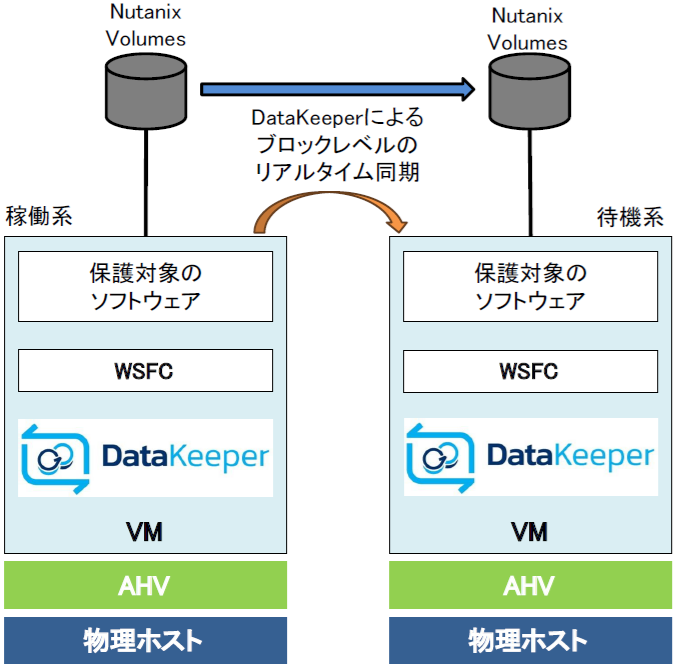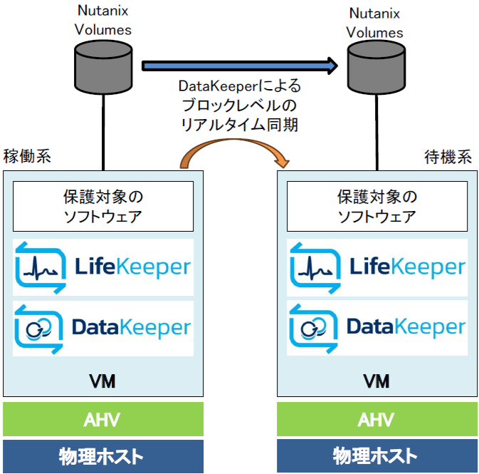 - DataKeeperは、各クラスターノードの仮想マシンに紐づいたローカルディスク(Nutanix Volumes)を、ブロックのレベルでリアルタイムに同期することで、レプリケーションされた共有領域を論理的な共有ストレージとして使うことができます。LifeKeeperとDataKeeperを組み合わせることで、共有ディスクが用意できない環境でもHAクラスターを構築できます。